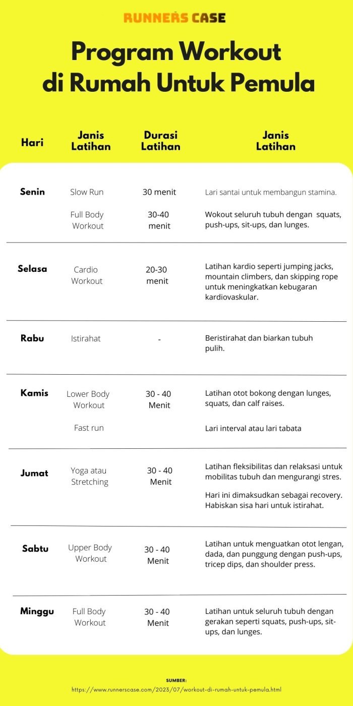 Jika Anda baru memulai program workout di rumah, penting untuk memulai dengan perlahan dan bertahap. Berikut adalah contoh program workout sederhana yang bisa Anda lakukan 3-4 kali seminggu: